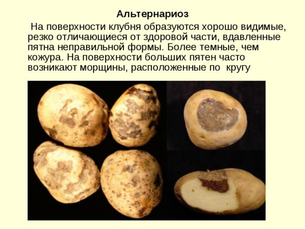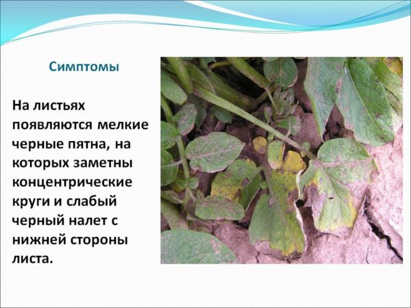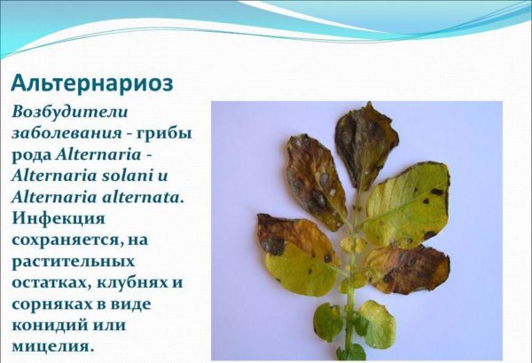 על פי התצלום ניתן לראות אלטרנטריוזת תפוחי אדמה. מחלות יכולות להפיץ חרקים, רוח, גשם. אלטרנטריוזיס מתפתחת במזג אוויר חם ובגשמים עזים. הטמפרטורה האופטימלית להתפתחות המחלה היא 26 מעלות.