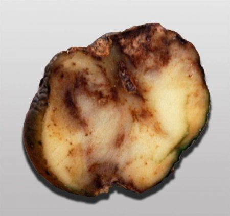 לחולה סרטן יש גידולים רבים בגדלים שונים. על פקעות, הגידולים הם קודם כל לבנים, אחר כך הם מתכהים ונרקבים. על גבעולים ועלים גידולים ירקרקים.
