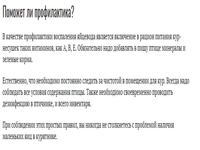 כאשר חומרים או יסודות זרים נכנסים לחלל הביוב, הם לרוב עוברים מעצמם. גוף העופות יכול להתמודד בכוחות עצמו. הפרה יחידה עוברת במהירות, אך אם ביצים קטנות ממשיכות להופיע, עדיף להתייעץ עם וטרינר.