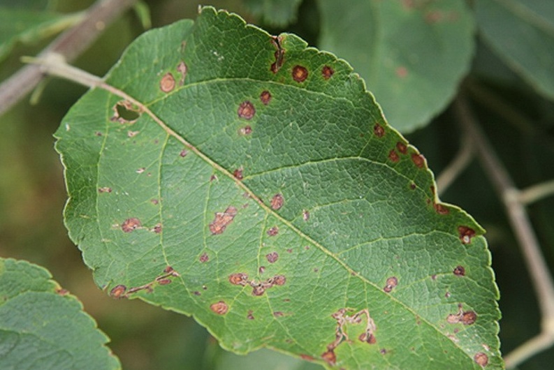 זה מופיע בצורת כתמים חומים, ממוסגרים על ידי שפה כהה. כתמים חומים משפיעים על העלווה. נבגים פטרייתיים נמצאים במרכז ונראים כמו נקודות שחורות קטנות. כל העלווה המושפעת מוסרת ונשרפת. עיגולי גזע של עצים חופרים. עץ התפוח מטופל באוריאה. ריכוז הפיתרון לעץ הוא 5%, לעיבוד מעגל הגזע - 7%.