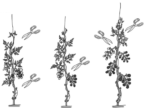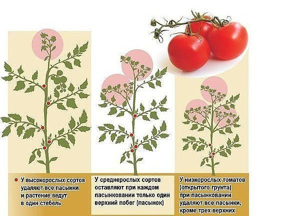 כלאיים מודרניים בגודל תחתון מגדלים על רכסים ללא צביטה, או שהם מסירים תהליכים לרוחב מצירי העלים מהם עד התפרחת הראשונה.