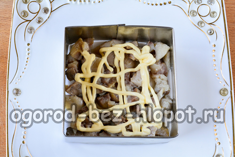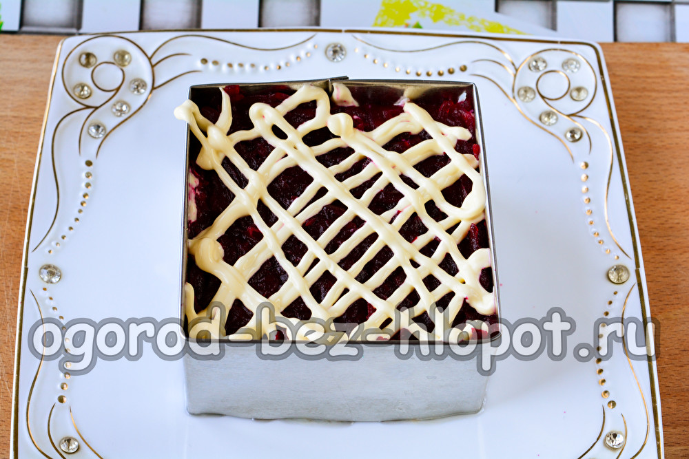 אנחנו לא ממליחים שכבות אלה, אלא משמנים מעט במיונז. כל שכבה נלחצת מעט במזלג כך שהמרכיבים רוויים זה בזה.