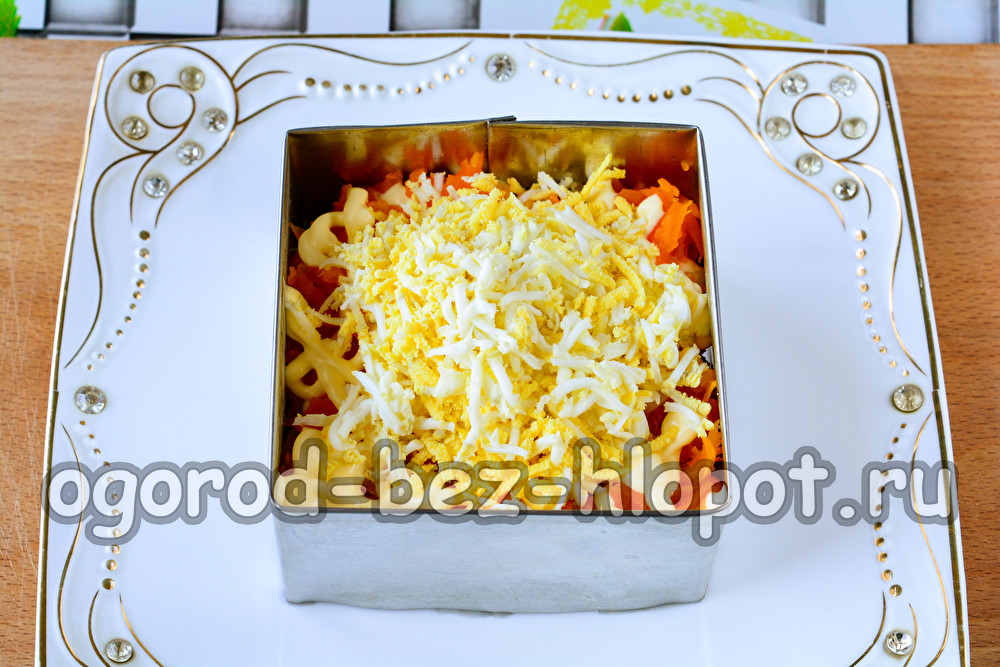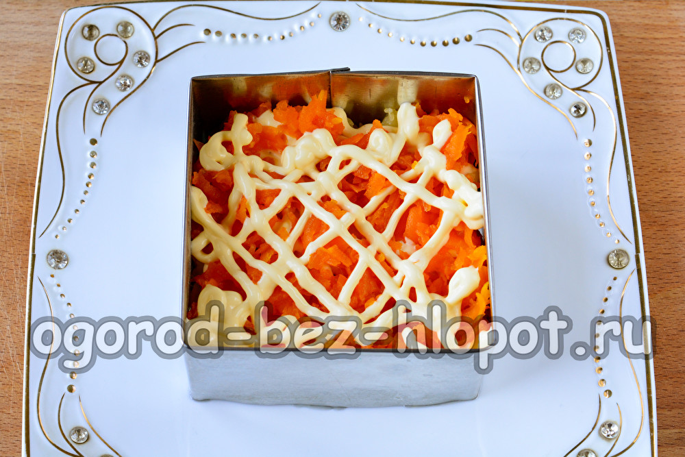 עכשיו קח גזר מבושל וטגר אותו על פומפיה בסלט. ממיסים מעט את הגזר ומצפים בשכבה דקה של מיונז.