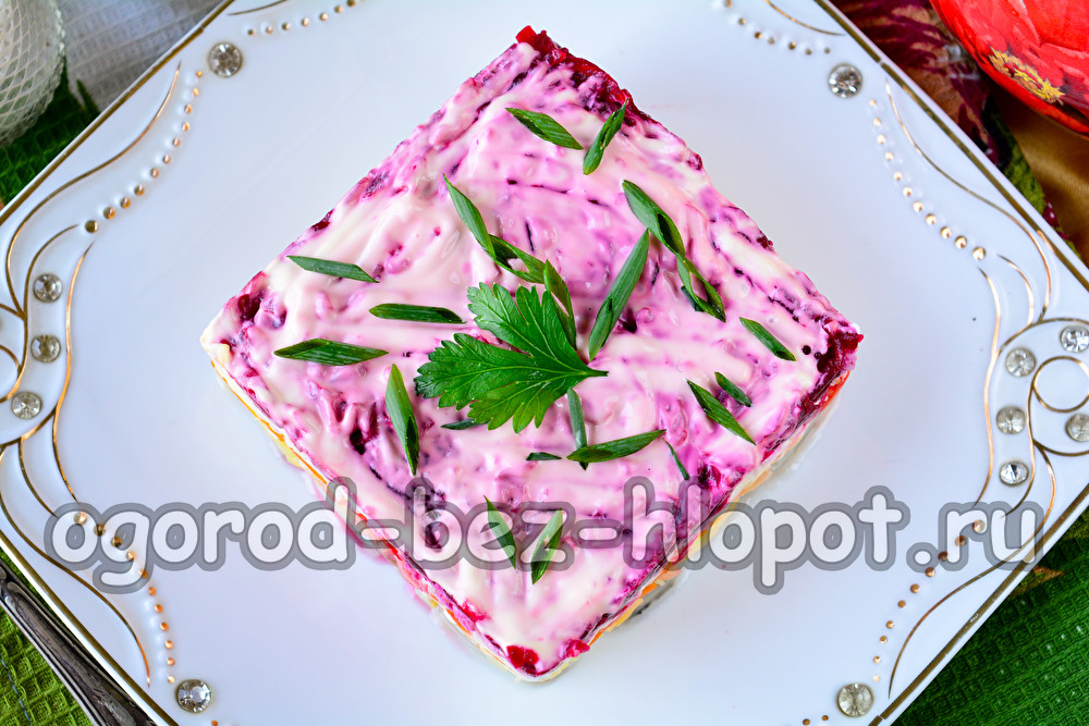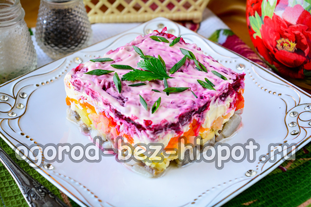 בואו נסתכל על מתכון לסלט, שם כל השכבות יהיו בסדר כמו שצריך. יש המון וריאציות של ההרכבה של "הרינג תחת מעיל פרווה", ואנחנו נכין מתכון קלאסי ונחלוק איתכם תמונות מפורטות.