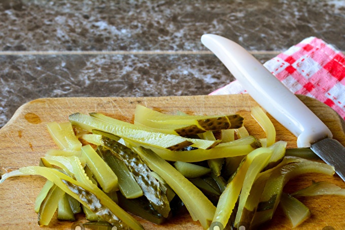 מלפפונים חמוצים חתוכים גם הם לרצועות, לאחר שגזזו את הזנבות.