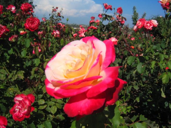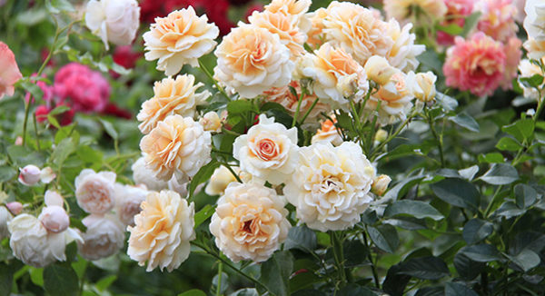 קבוצת ורדים שיחים עם פריחה בשפע. צמחים ריחניים וחסרי יומרות.