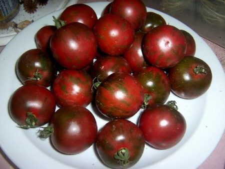 בשרו של זן זה עסיסי, צבעו חום בורדו. על שיח העגבניות עלים ירוקים בהירים.