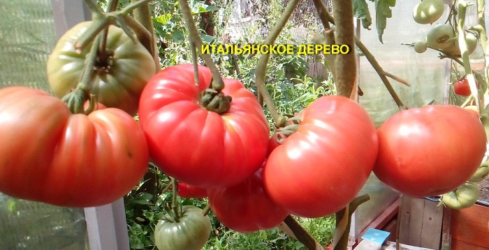 מגוון מעולה, נטוע "עץ איטלקי" בחממה ובמיטות, נהיה מעניין לערוך ניסוי. הוא יצר את השיחים בשני גבעולים, היבול היה מצוין, אבל העגבניות היו מעט גדולות יותר בגינה. בתנאי חממה הם הבשילו בסוף יולי, באוויר הפתוח כשבועיים אחר כך. עגבניות לא היו חולות, השיחים גדלו מתחת לשני מטרים, הטעם של הפירות פשוט טעים. אני ממליץ על כולם.