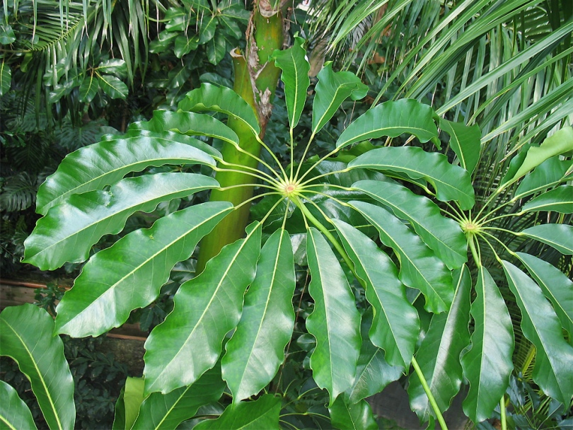 - פלמטה. שפלר הניו זילנדי בטבעו גדל עד 8 מ '. העלים דומים לעלים דקלים, פתוחים עם מטריה ומכילים עד 10 צלחות מחודדות דקיקות. מין זה גוסס, שכן ניו זילנדים חתכו אותו באופן מסיבי עבור חומרי גלם להכנת מזכרות.