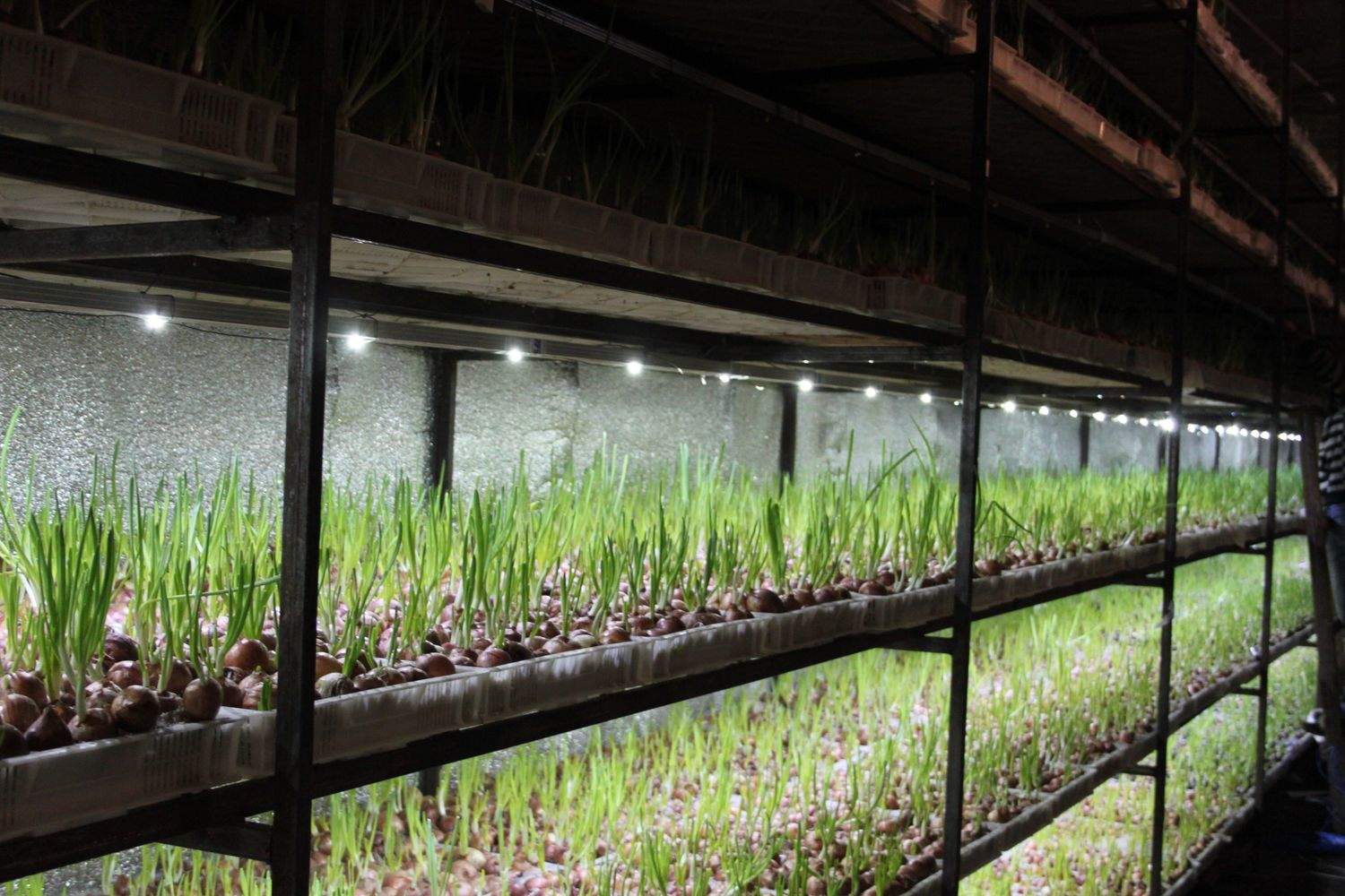 שיטה זו של גידול בצל על ירקות חוסכת מקום בחממה, מקטינה עלויות עבודה וזמן, והיא יעילה במיוחד בעת שימוש במדפים. נורות תקועות במצע פורה ומעמידות אותן קרוב.