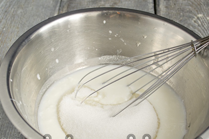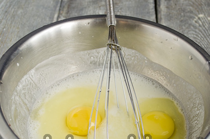 אנו מערבבים קפיר עם סוכר עד שגרגירי הסוכר נמסים לחלוטין, שוברים ביצי עוף טריות בקערה, שופכים חצי כפית מלח שולחן.